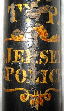 The 12" baton is hand painted with the Jersey Arms of three Leopards on a red shield and the 'Ty - JERSEY POLICE' title below.